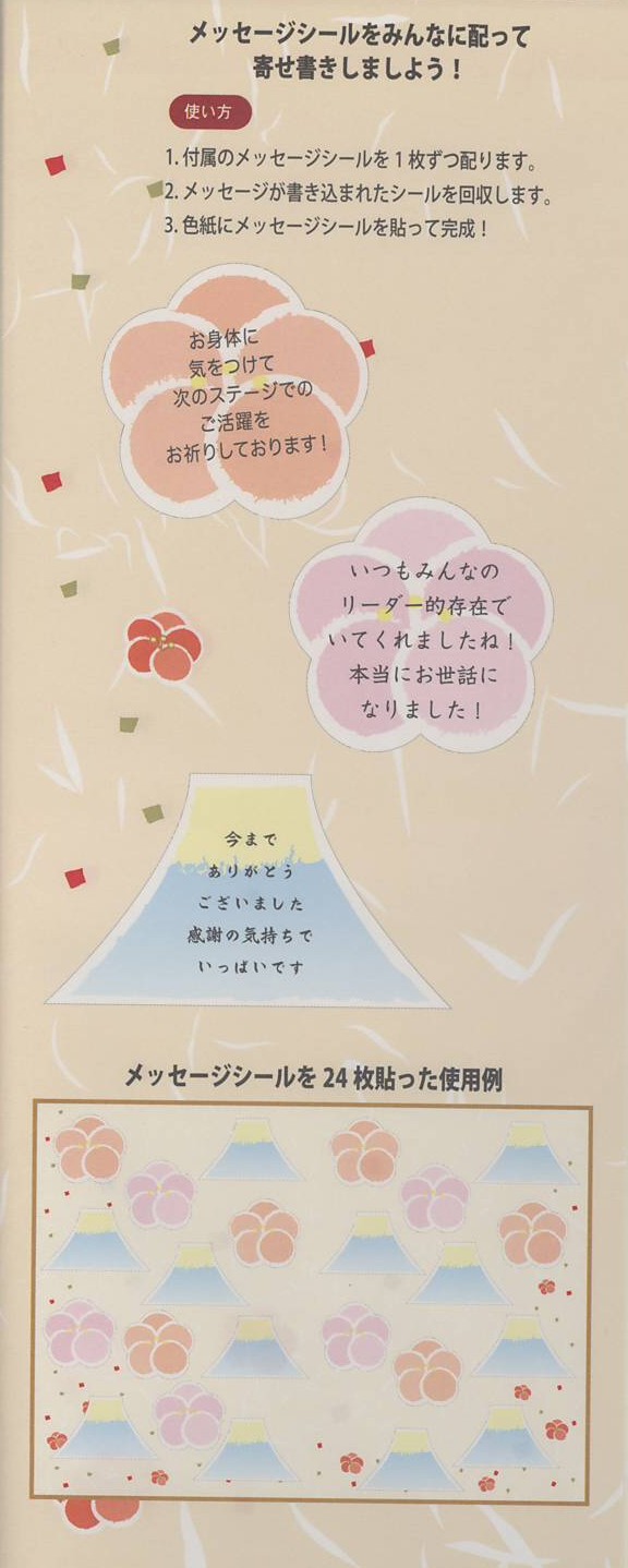 メッセージシールをみんなに配って寄せ書きできます。大勢でも時間をかけずに寄せ書きでき、便利です。