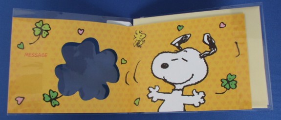 クローバーの形に窓抜き加工されているサンキューカードです。中左面にメッセージ記入欄があります。